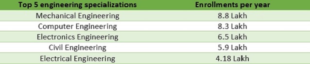 Mechanical Engineering, Computer Engineering, Electronics Engineering, Civil Engineering and Electrical Engineering are the top five engineering streams according to MHRD’s AISHE report. Besides these, there are numerous other engineering specializations/branches that candidates can choose from. Given below are some: